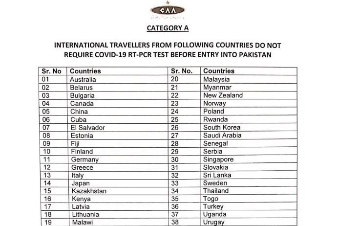 Category A: passengers from these countries do not require RT-PCR test before travelling to Pakistan. List of countries.