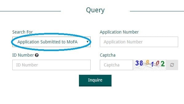 3. Scroll down and select "Application Submitted to MoFA", enter "Application Number", "Id Number" and Captcha code.